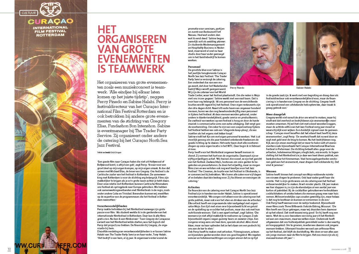 Percy raakte betrokken bij het filmfestival vanwege zijn grote passie voor film. ‘Als student werkte ik in de garderobe van het internationale filmfestival in Rotterdam. Daar kon ik alle films gratis zien. Nu ben ik een filmkenner.’ Toen Gregory de Curaçaose variant van het filmfestival wilde starten, was het logisch dat Percy dat project zou trekken. De financiën bij Gregory, de organisatie bij hem. Diezelfde verdeling van verantwoordelijkheden is er tussen Sabine Halabi van The Trader Party Service en haar vader, Tony Halabi. ‘Het bedrijf is van hem, al 25 jaar. Ik organiseer verder vooral de promotie voor seminars, partijen en events van Restaurant Fort Nassau. Heel wat anders dan wat ik eerst deed.’ Sabine begon namelijk ooit als wedding planner. Ze studeerde Modemanagement en Hospitality Business in Nederland, maar werd al snel na haar studie door haar vader gevraagd om in het familiebedrijf te komen werken.